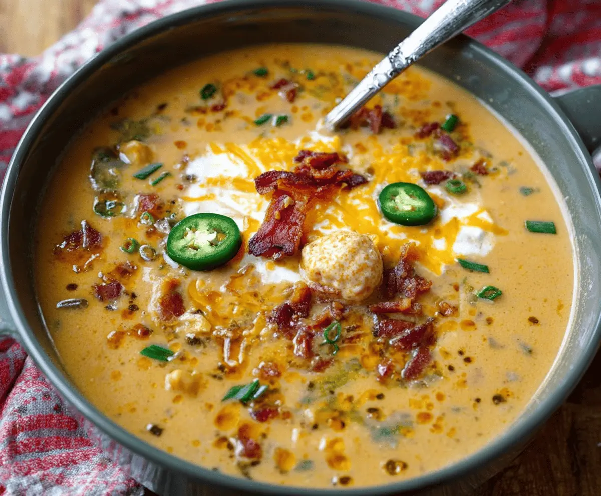 Jalapeno Popper Soup is a creamy, cheesy bowl filled with just the right amount of spicy kick from fresh jalapenos. It’s like all your favorite jalapeno popper flavors—cheese, bacon, and a little bit of heat—all cozy and warm in one comforting soup. The texture is smooth and rich, with little bites of jalapeno and cheese that make every spoonful exciting.